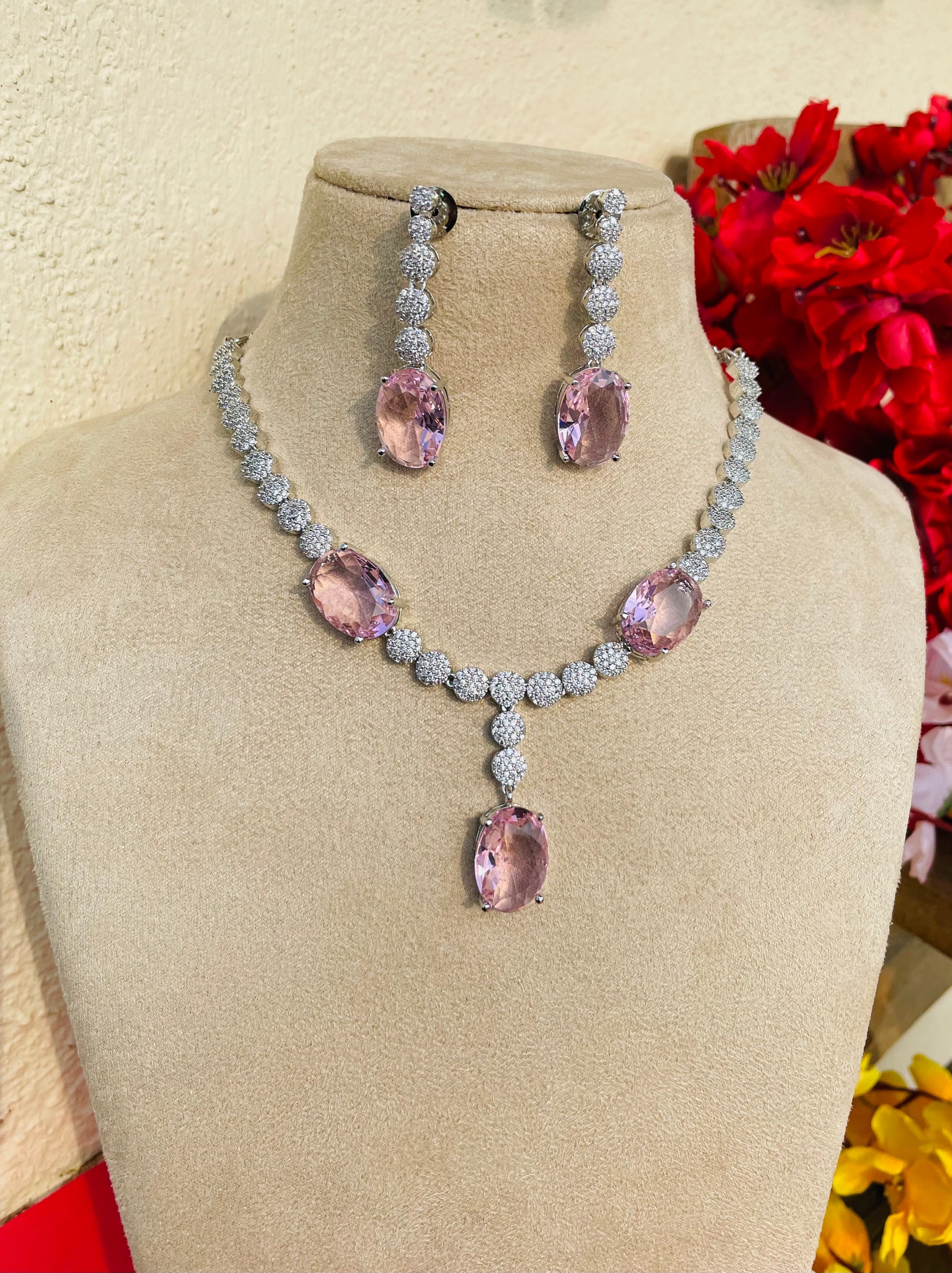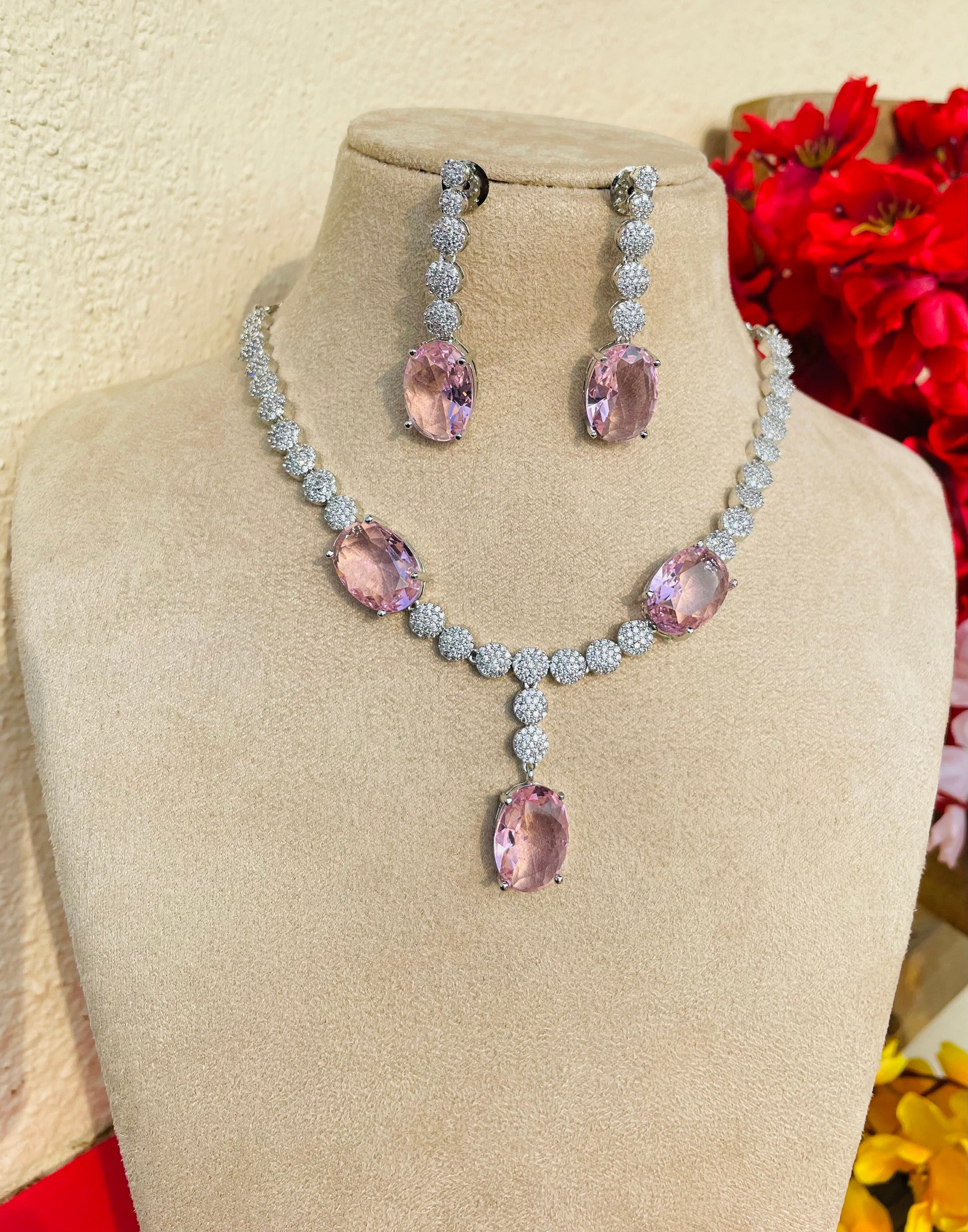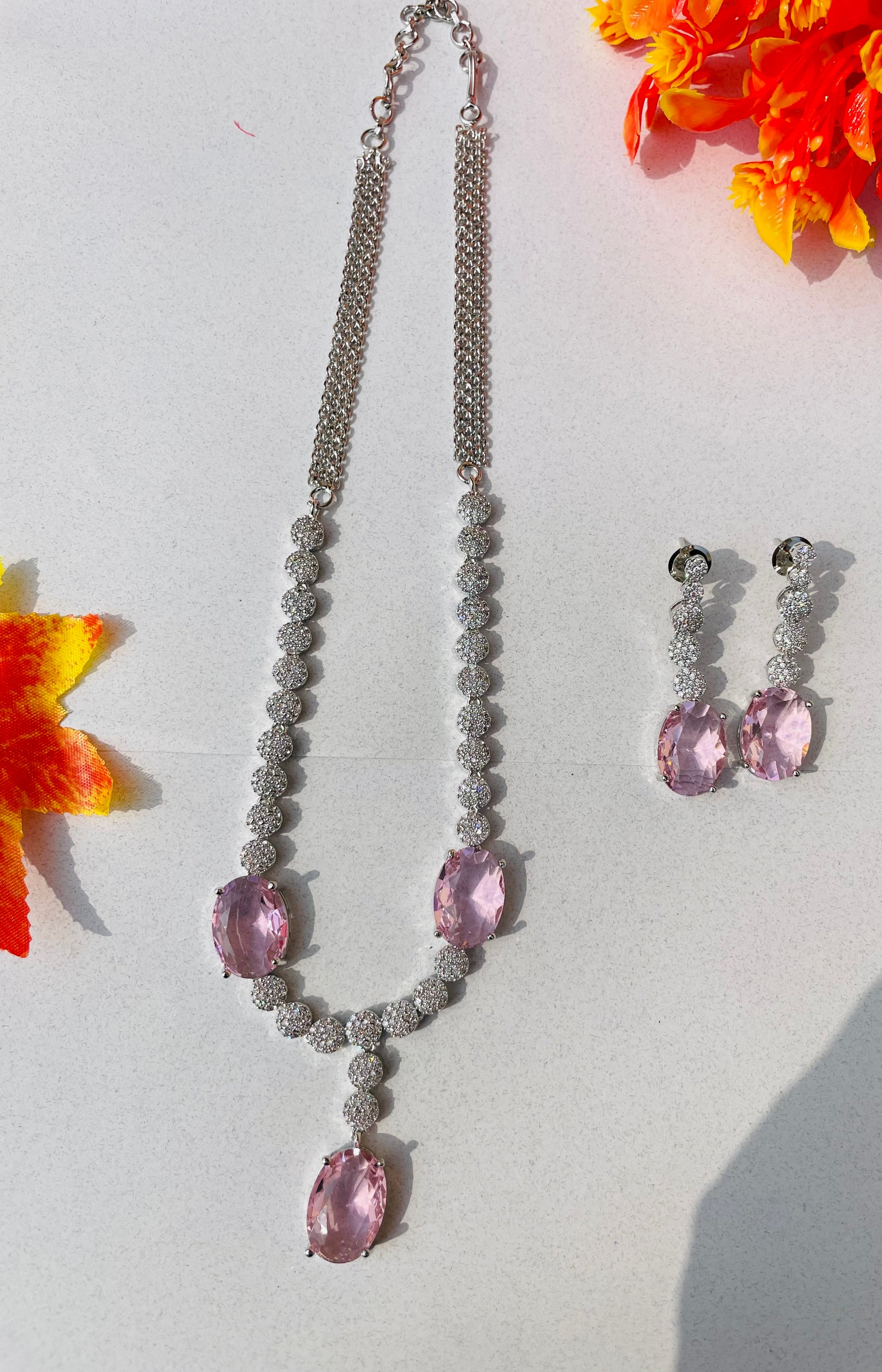 Add a touch of sparkle to any occasion with this stunning American Diamond necklace set. Crafted for elegance and shine, it features a beautifully detailed necklace with matching earrings – perfect for parties, weddings, or festive celebrations.